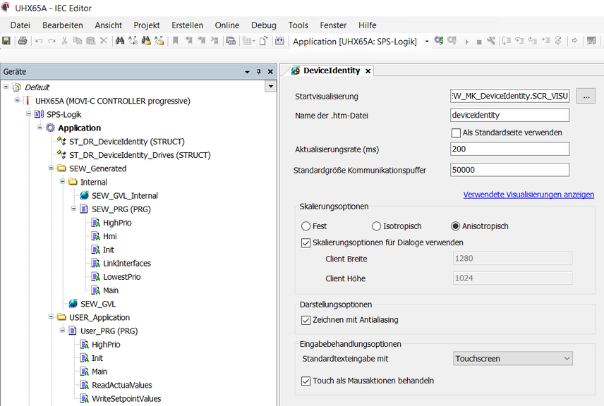 - Wählen Sie in der Konfiguration der WebVisu als "Startvisualisierung" die in der Bibliothek "SEW MOVIKIT DeviceIdentity" enthaltene Visualisierung "SCR_VISU".