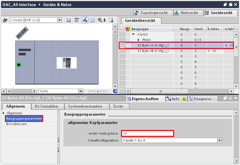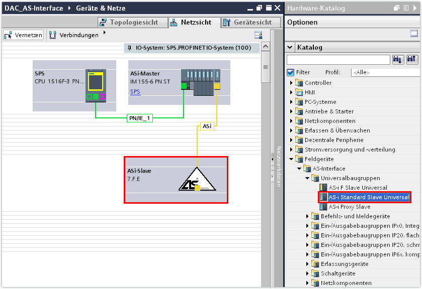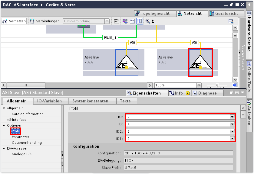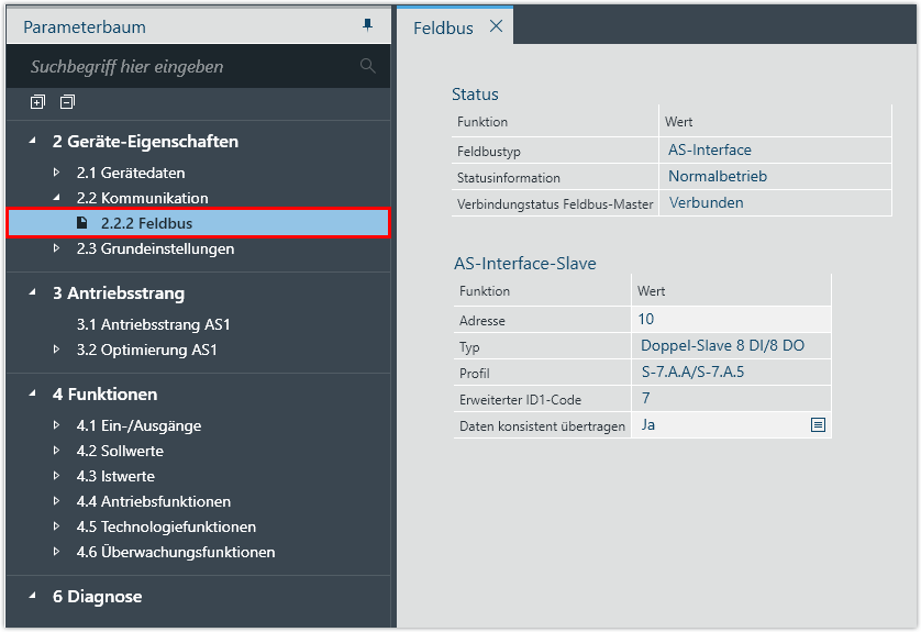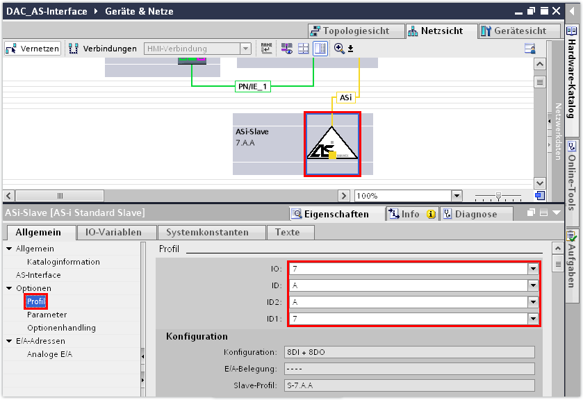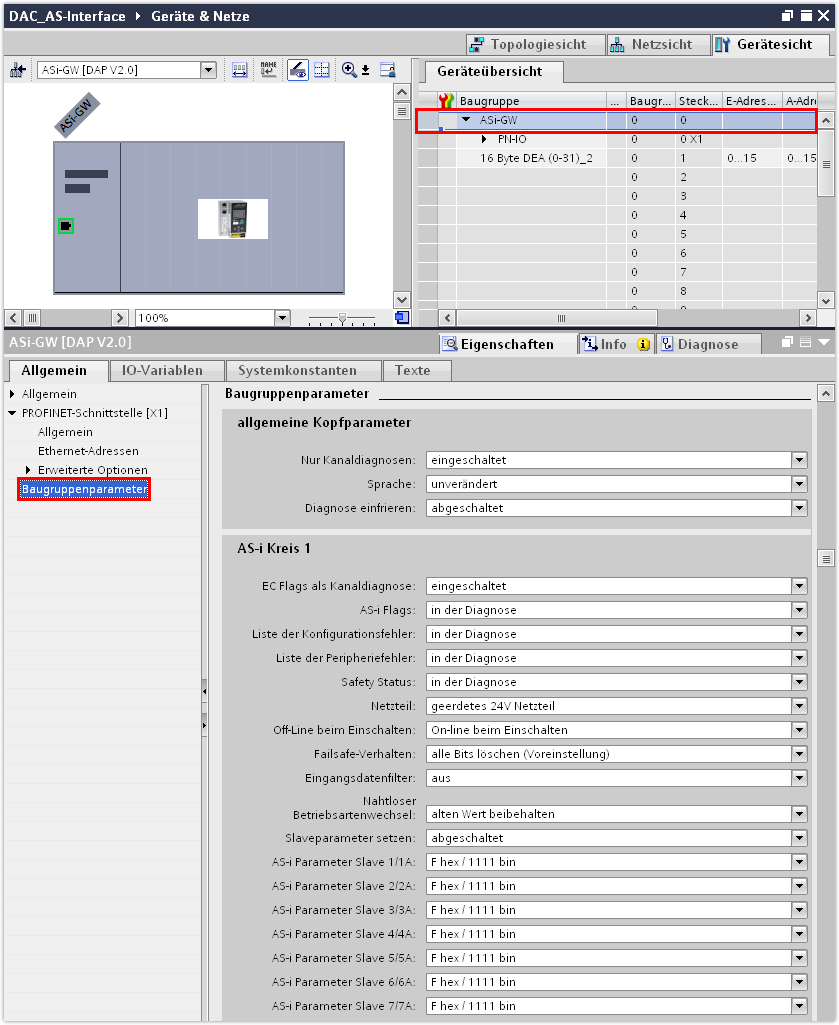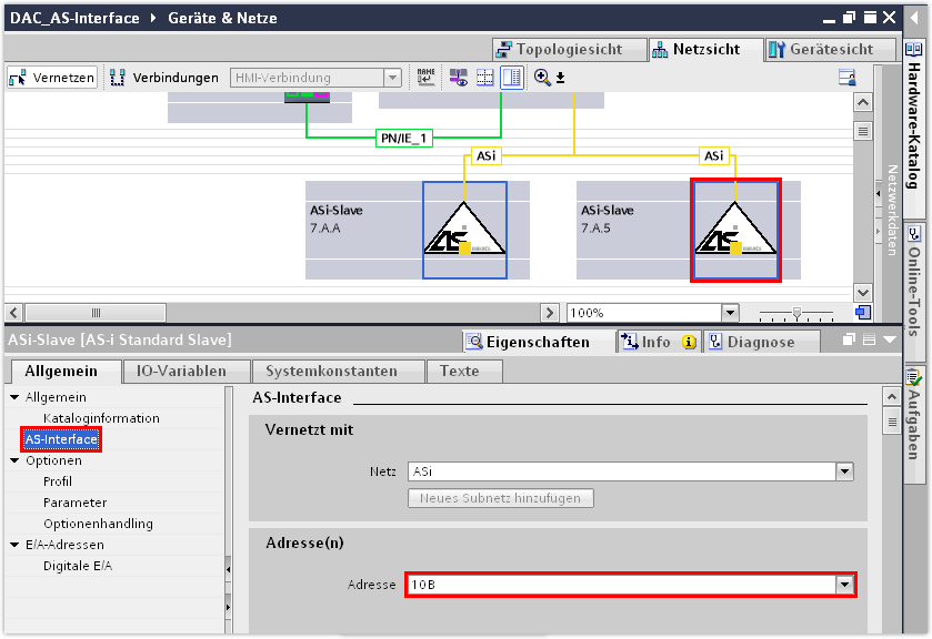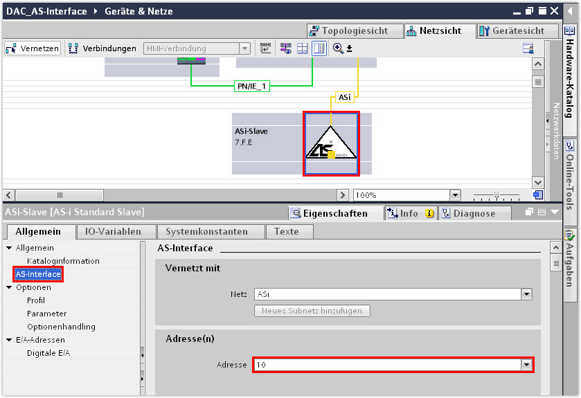 Die Inbetriebnahme wird an einem Beispiel näher erläutert. Im Beispiel wird ein dezentraler Umrichter in der Kommunikationsvariante DAC in ein AS‑Interface-Netzwerk eingebunden.