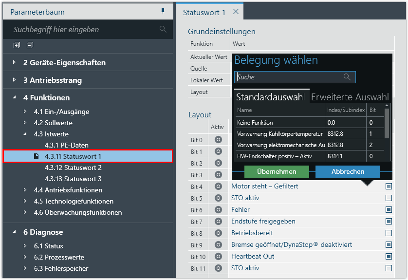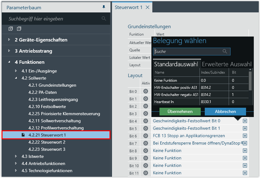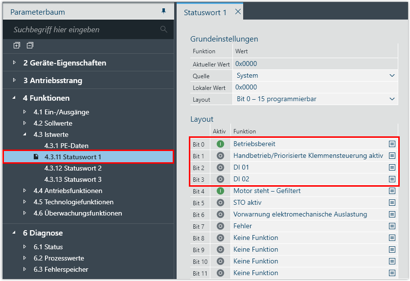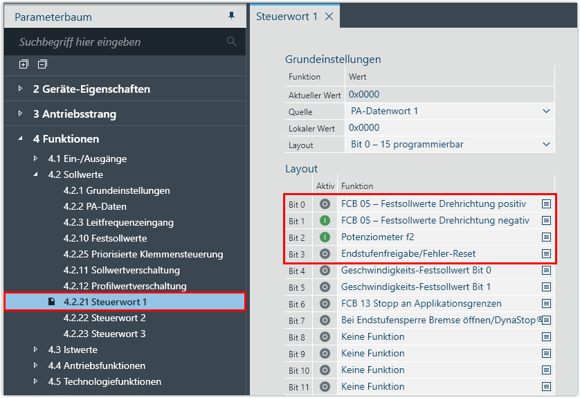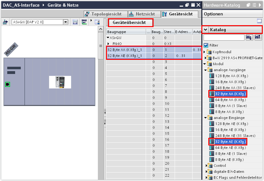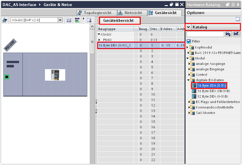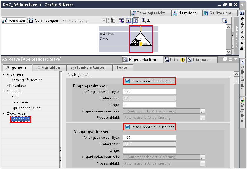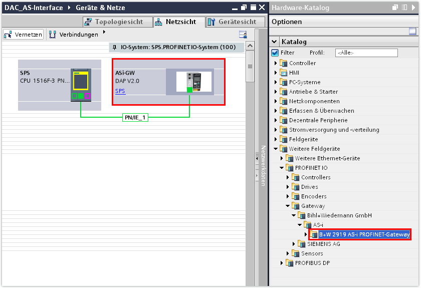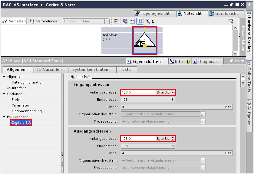Die Inbetriebnahme wird an einem Beispiel näher erläutert. Im Beispiel wird ein dezentraler Umrichter in der Kommunikationsvariante DAC in ein AS‑Interface-Netzwerk eingebunden.