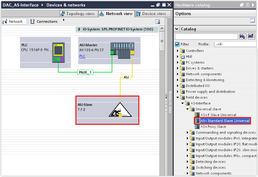 - Open the hardware catalog. Under [Field units] > [Universal modules], select the entry "AS-i Standard Slave Universal" and assign it to the AS-Interface master in the Network view.