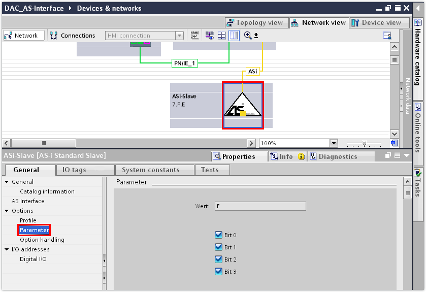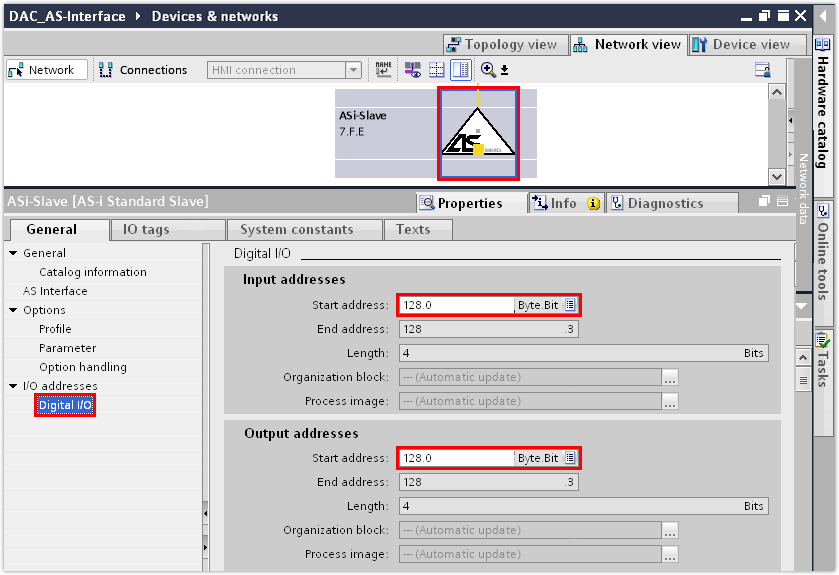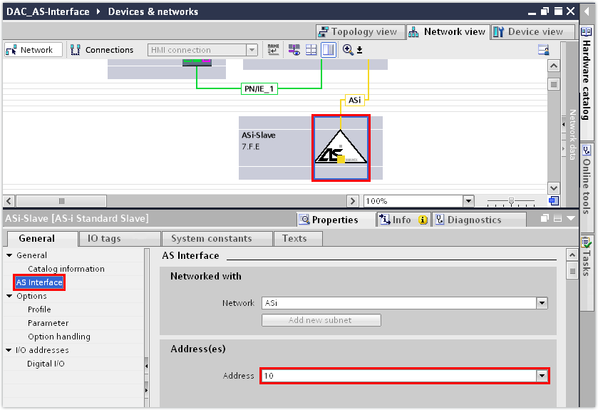 - In the "AS-Interface" group in the inspector window (lower editor section), enter the device address that you have also set in the inverter.