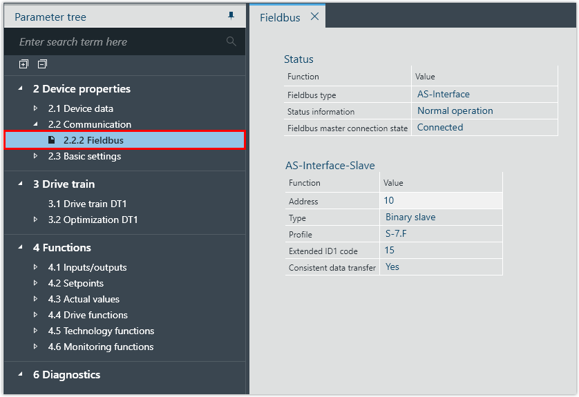 - Check the device address, device type and device profile under [Device properties] > [Communication] > [Fieldbus].
