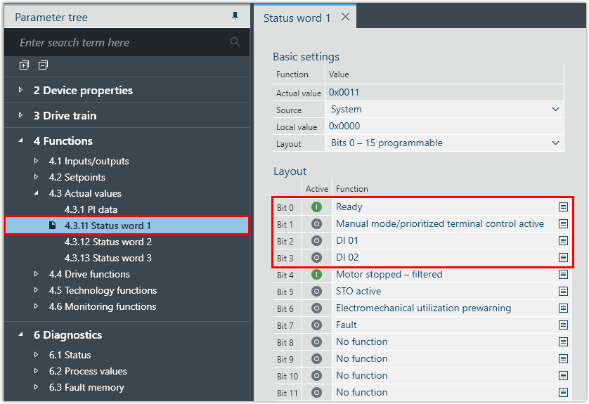 - Check the current state of the input data bits under [Functions] > [Actual values] > [Status word 1]. In the case of a binary device (number of data bits 4 DI/4 DO), only the first 4 status bits are transmitted.