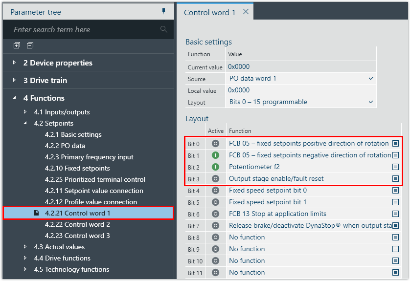 - Check the current state of the output data bits under [Functions] > [Setpoints] > [Control word 1]. In the case of a binary device (number of data bits 4 DI/4 DO), only the first 4 control bits are transmitted.