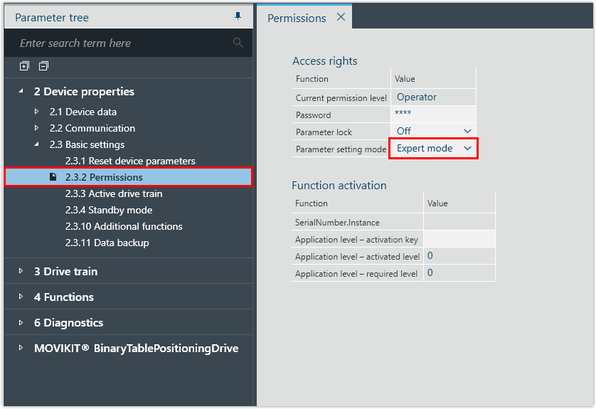 - Set the parameter setting mode by selecting [Device properties] > [Basic settings] > [Permissions].