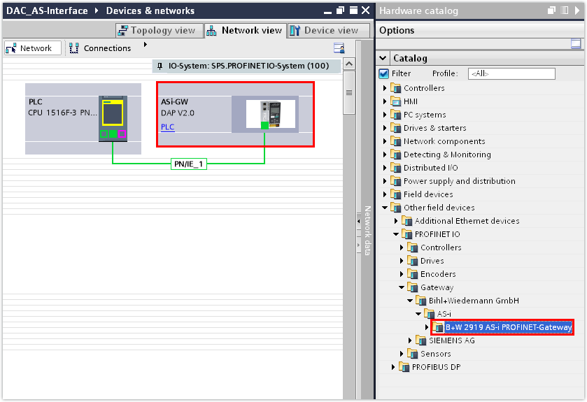 - Open the hardware catalog. Under [Other field units] > [PROFINET IO] > [Gateway] > [Bihl+Wiedemann GmbH] > [AS-i], select the AS‑Interface master and assign it to PLC in the network view.