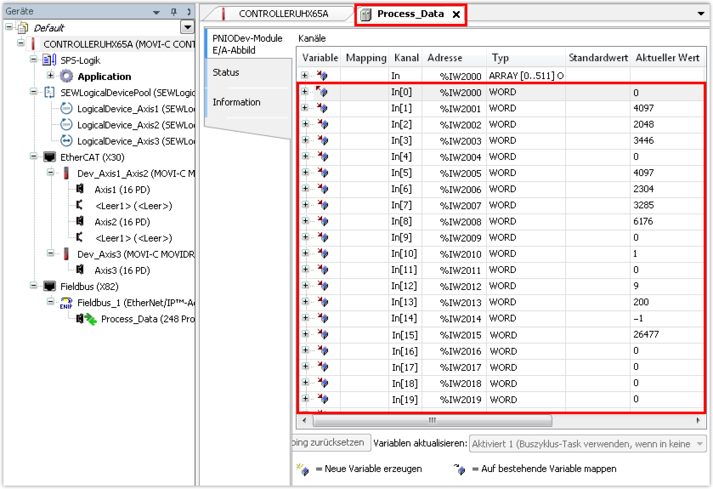 - Im rechten Bildschirmbereich werden die Prozessdatenwörter angezeigt, die die SPS mit dem Controller austauscht.