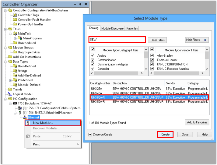 - Dans cet exemple, le filtre appliqué est "SEW" et le contrôleur UHX65A-R est utilisé comme partenaire de communication.