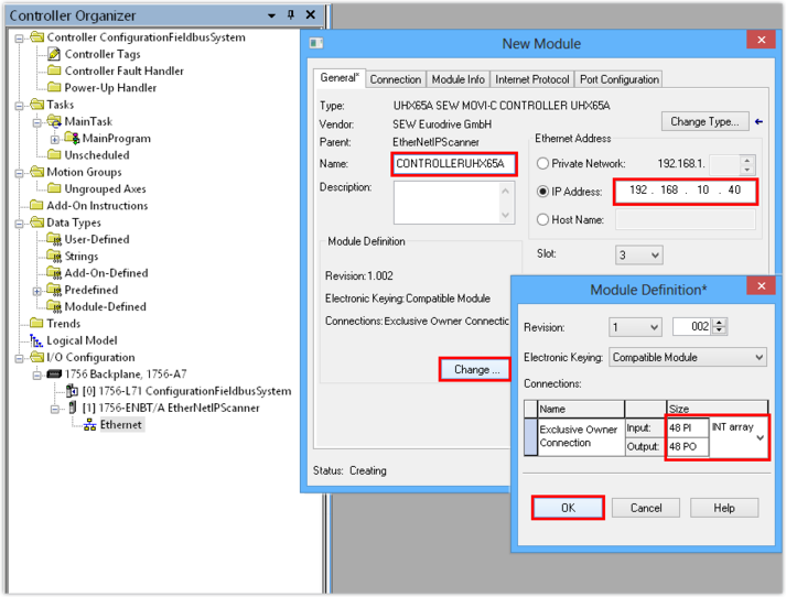 - Dans cet exemple, l'adresse IP du contrôleur est la suivante : 192.168.10.40. 16 mots de données process, destinés à garantir la communication, sont mis à disposition de chaque module de variateur d'application (esclave du contrôleur). Il en résulte en tout 48 (3 x 16) mots de données process.