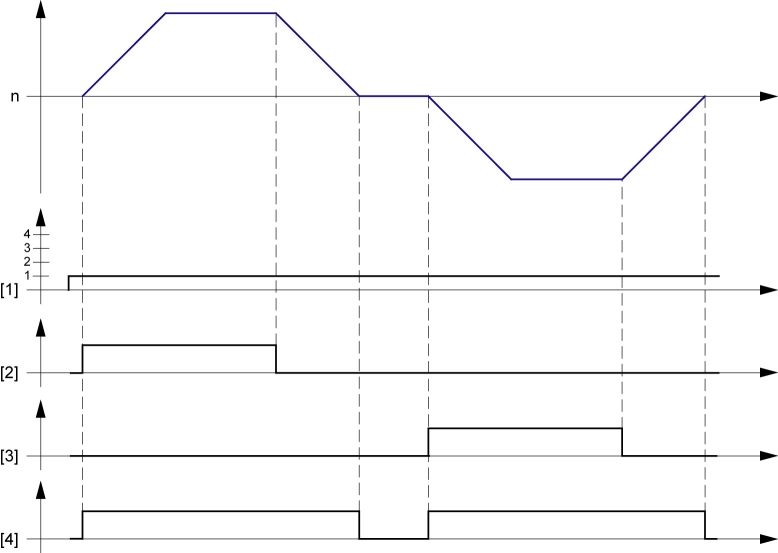 L'illustration suivante montre la vitesse mesurée de l'entraînement en fonction de l'état des signaux d'entrée et de sortie en mode manuel.