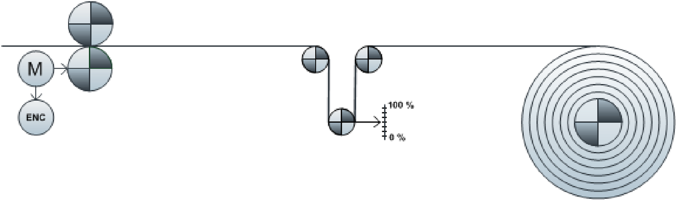 Zugkraftbestimmendes Auf- oder Abwickeln von Material, wobei sich die Zugkraft bei der Tänzerlagereglung durch das Tänzergewicht und bei der Zugkraftregelung durch Regelung der Solldrehzahl über die Zugkraftmessung ergibt.