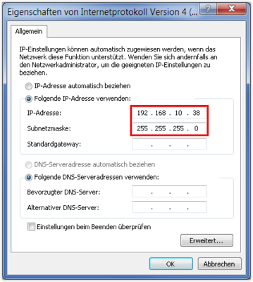 - Tragen Sie unter Eigenschaften des Internetprotokolls die IP‑Adressparameter des Engineering‑PCs ein. Beachten Sie, dass die IP‑Adresse des Engineering-PCs sich von der IP‑Adresse aller anderen Netzwerkteilnehmer unterscheidet und somit eindeutig ist. Dabei muss sich die Netzwerkadresse (hier erste 3 Adressblöcke) für alle Netzwerkteilnehmer übereinstimmen und die Teilnehmeradresse (hier letzter Adressblock) des Engineering-PCs von der Netzwerkadresse aller anderen Teilnehmer unterscheiden.