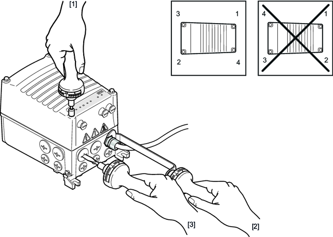 [2] | Ziehen Sie die Kabelverschraubung mit einem Anziehdrehmoment gemäß dem Kapitel "Mechanische Installation" > "Anziehdrehmomente" > Kabelverschraubungen .. fest. |