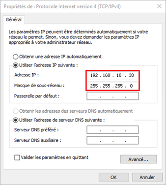 - Dans cet exemple, l'adresse IP du PC d'ingénierie est la suivante : 192.168.10.38
