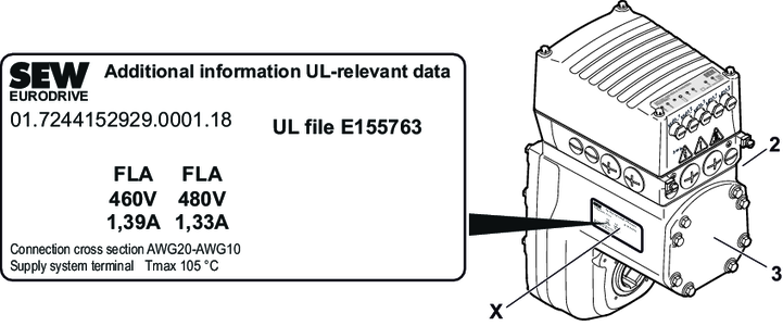 La siguiente imagen muestra un ejemplo de la placa de características opcional para unidades de accionamiento MOVIGEAR® performance según la normativa eléctrica UL/CE: