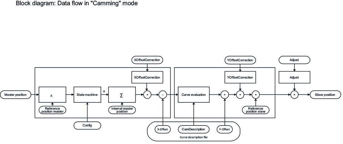 The term camming (electronic cam) refers to a definite assignment of positions between a master drive and a slave drive. In Camming operating mode, master-based profiles are generated where the position of the slave axis results from the position of the master axis based on a curve description.