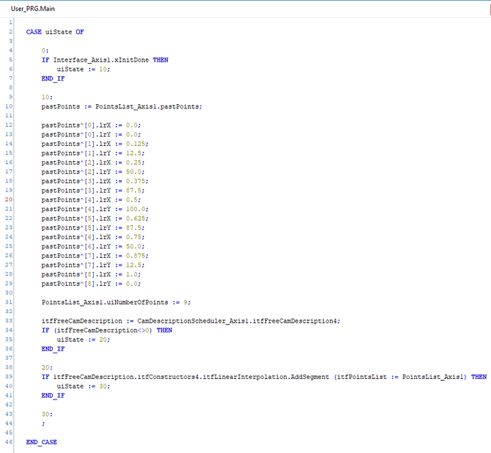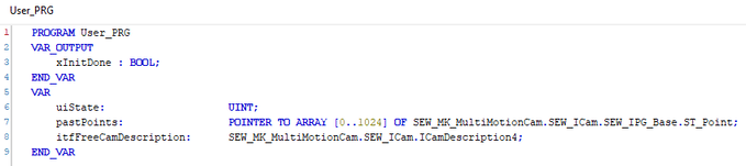 POINTER TO ARRAY [0..1024] OF SEW_MK_MultiMotionCam.SEW_ICam.SEW_IPG_Base.ST_PointPOINTER TO ARRAY [0..64] OF SEW_MK_MultiMotionCam.SEW_ICam.SEW_IPG_Base.ST_Point- Assign the corresponding property of the "PointsList" or "PointsListSpline" to the local variable.