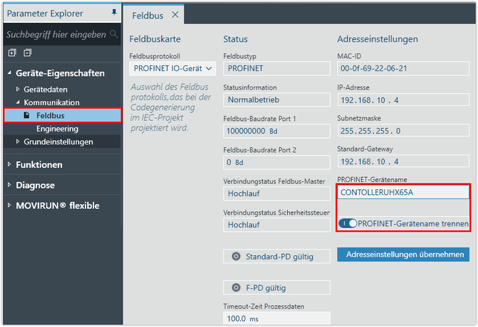 Die feste Kopplung des MOVISUITE®-Gerätenamens und PROFINET-Gerätenamens können Sie unter [Geräte-Eigenschaften] > [Kommunikation] > [Feldbus] aufheben. Damit kann der MOVISUITE®-Gerätename frei gewählt und geändert werden, ohne Auswirkungen auf die PROFINET-Kommunikation.