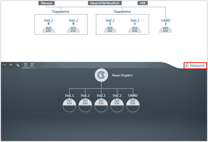 Die Inbetriebnahme wird an einem Beispiel näher erläutert. Im Beispiel wird ein Applikationsumrichter MOVIDRIVE® modular mit Geräteprofil EtherCAT® in ein EtherCAT®-Netzwerk eingebunden.