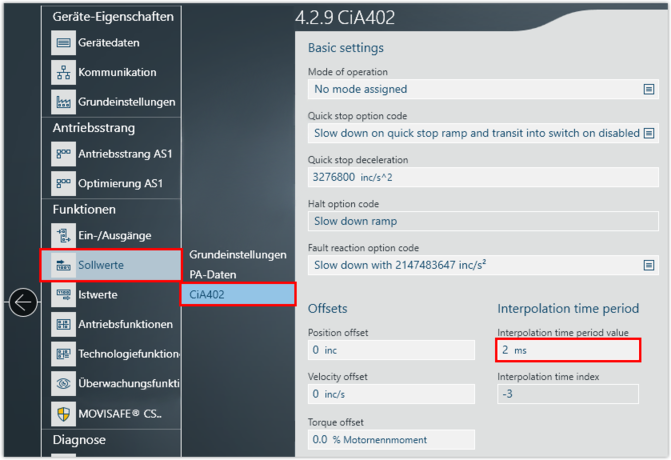 Einstellungen, die bei der Einbindung eines Umrichters mit Geräteprofil CiA402 zusätzlich festgelegt werden müssen, werden gekennzeichnet.