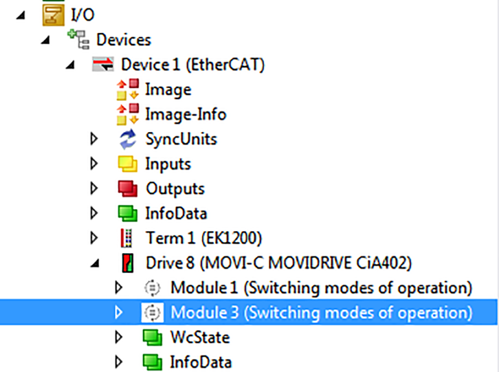 Regardless of whether a MOVIDRIVE® modular single-axis module MDA.. or a double-axis module MDD.. is physically present in the EtherCAT® network, a single-axis module (a motion axis) is created and linked in the I/O configuration.