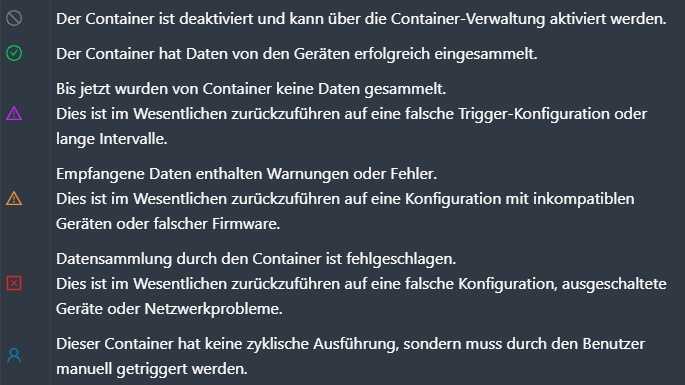 In den Registern der verschiedenen Geräte werden alle jeweils angelegten Container, deren zugeordnete Geräte sowie statistische Werte und Fehlermeldungen angezeigt. Die Ansicht der Geräte kann über die Auswahlliste rechts oben nach Paramater- oder Scope-Containern gefiltert werden. Den Geräten untergeordnet werden die jeweils ausgelesenen Parameter-Werte oder Scope-Aufzeichnungen angezeigt.