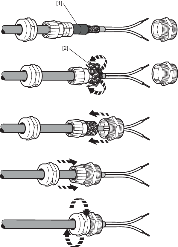 - First screw in the lower cable glands, and then the upper cable glands and the screw plug in the following sequence: [4], [2], [3], [1].