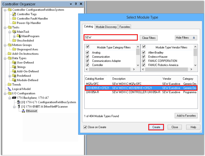 - Add the MOVIDRIVE® technology application inverter from the hardware catalog to the network.