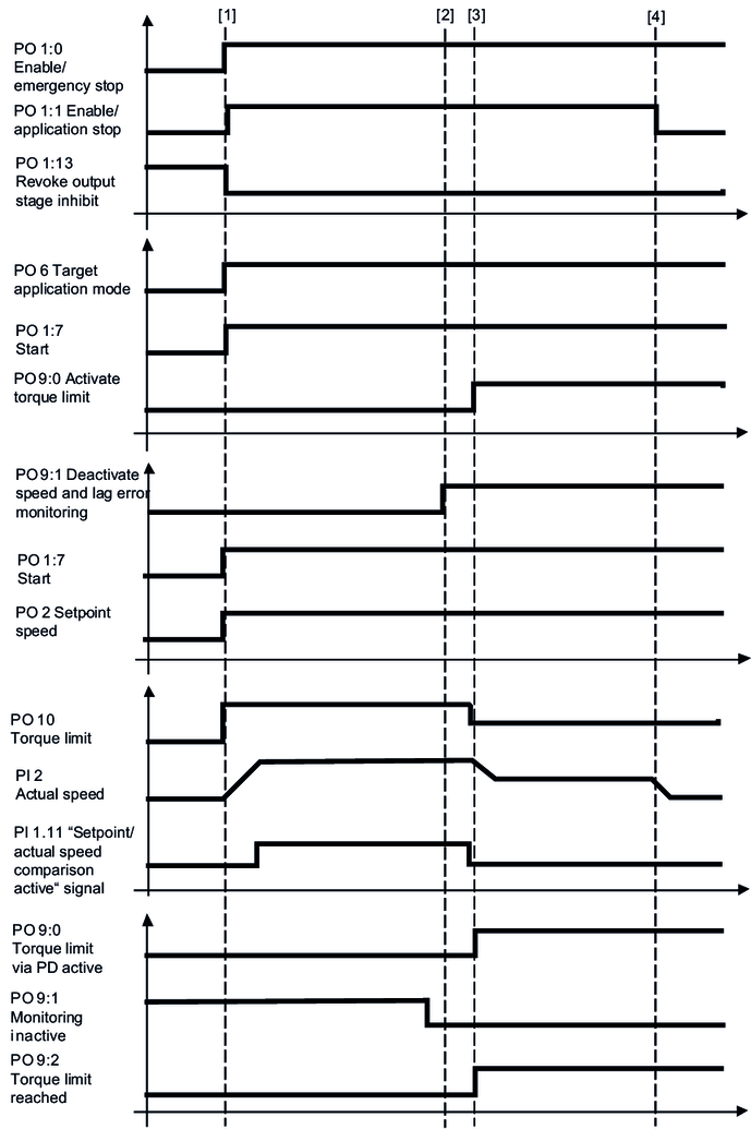 This additional function activates the utilization of the control word for the torque limit. The control word can also be used to deactivate the speed monitoring and lag error monitoring.