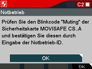 - Bestätigen Sie die folgende Frage mit der Taste <OK>: "Möchten Sie den Notbetrieb starten? HINWEIS: Alle Antriebssicherheitsfunktionen werden damit deaktiviert."