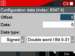 数据 | 按设定的偏移量输入数据。数据的表示形式由数据类型决定。 通过 <OK> 键确认输入后,参数将被写入变频器中。 |