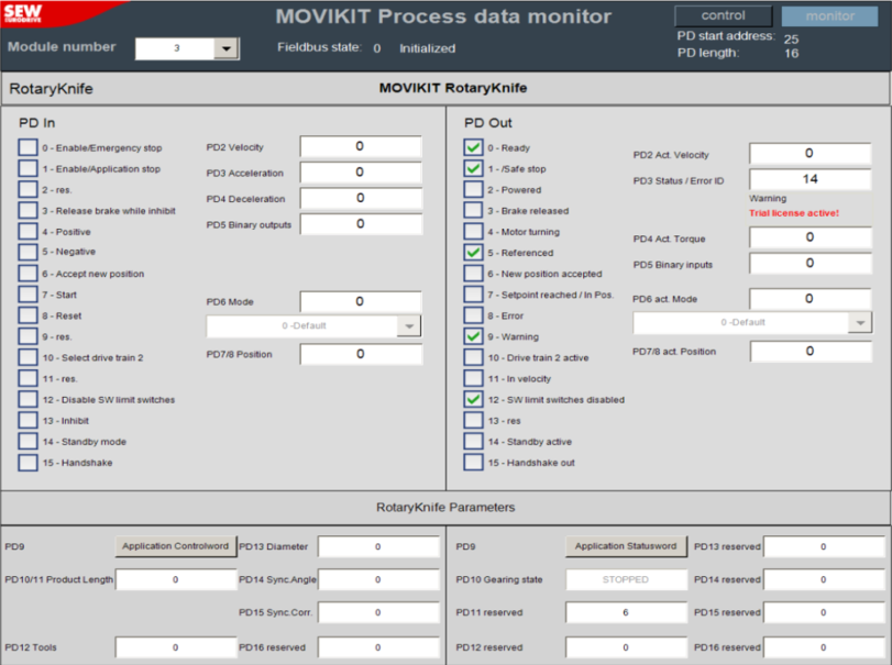 The MOVIKIT® fieldbus monitor is a tool in the IEC Editor for monitoring and controlling the fieldbus interface. The MOVIKIT® fieldbus monitor accesses solely the data of the fieldbus interface and represents the process input and process output data exchanged between the higher-level controller and the software module.