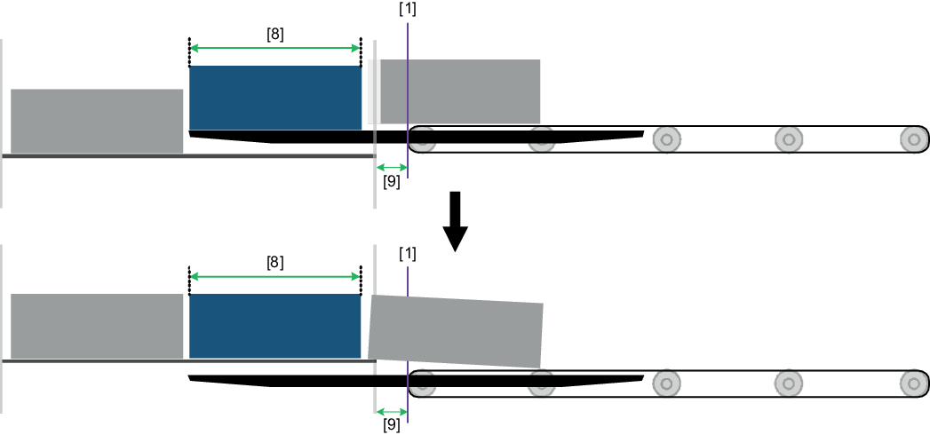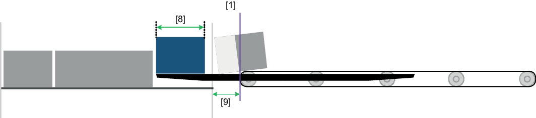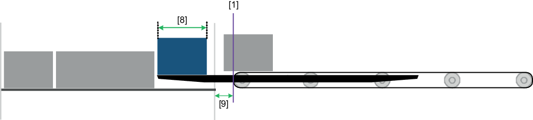 - For the suggested value, 20% of the "Shortest box length [8]" is used as the basis – in the same manner as the "Belt stop distance" – but is limited in accordance with the "Distance between belt end and storage location [9]" for retrieving a box from storage depth 1.