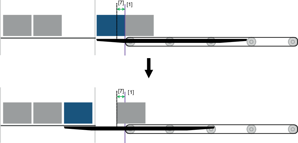 - The stop distance of the belt during a storage process describes the distance the belt travels after the box has left the belt. This means the box is moved at a speed greater than 0 after it has been transferred to the telescope. The "Belt stop distance" should be set in such a way that boxes that are not to be transferred to stock remain on the belt.