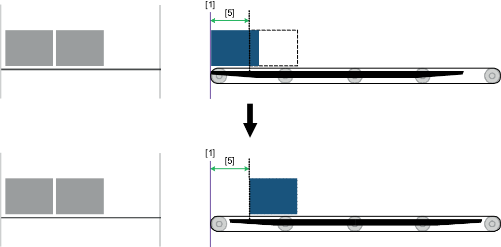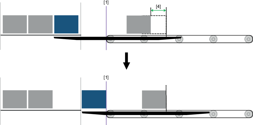 - Distance a belt is allowed to travel to reach the transfer speed of a box at a synchronous point not equal to 0 during the process of removing a box from stock. This parameter should be set taking into account the position of boxes already present on the load handling device.
