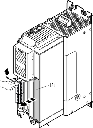 - Remove the safety cover [1] from the front of the inverter. The slot in which the card is installed depends on the card used.