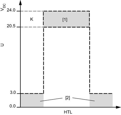 The signal levels are typically Vlow ≤ 3 V and Vhigh ≥ VB - 3.5 V. The signals are transferred symmetrically and evaluated differentially. Because of this and due to the high voltage level, HTL encoders have excellent EMC performance.