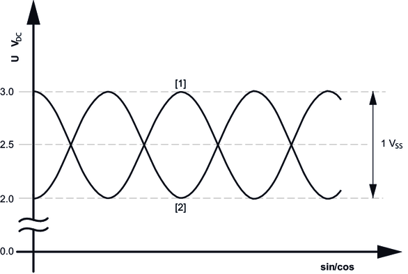 Sin/cos signals are generally superimposed over a DC voltage of 2.5 V. As the sin/cos signals are transferred symmetrically and evaluated differentially (VSS = 1 V), they are impervious to asymmetrical interference and have excellent EMC performance.