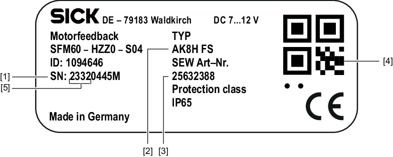 The following figure shows an example of a nameplate for a Sick encoder. For the structure of the type designation, refer to chapter Type designation for encoders from SEW‑EURODRIVE.