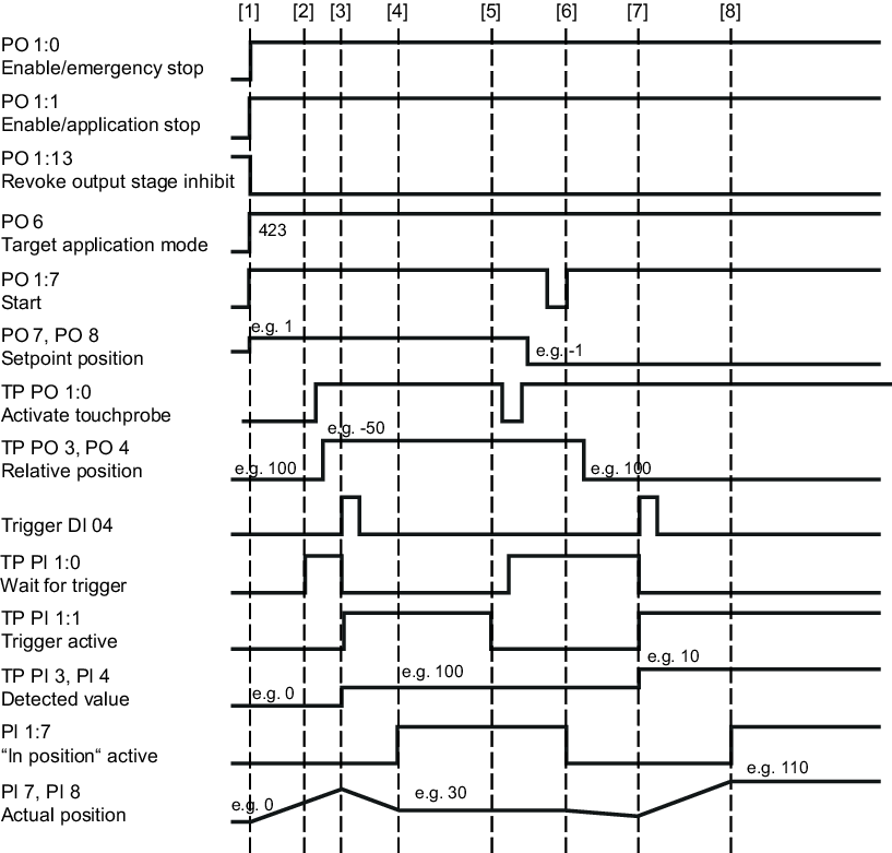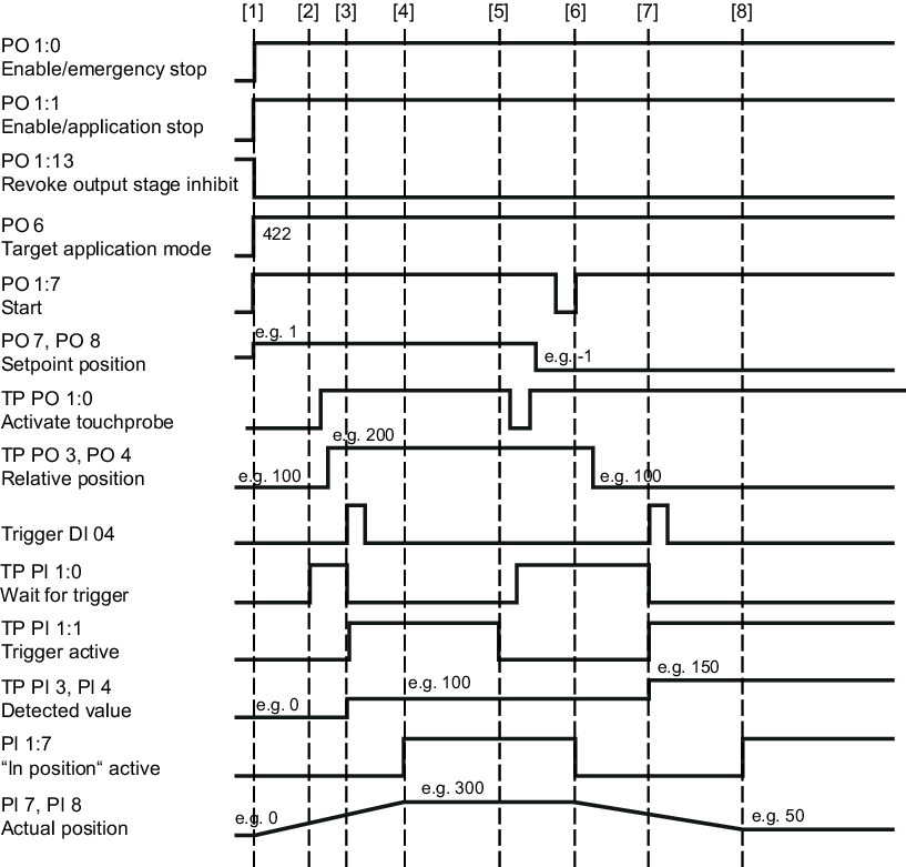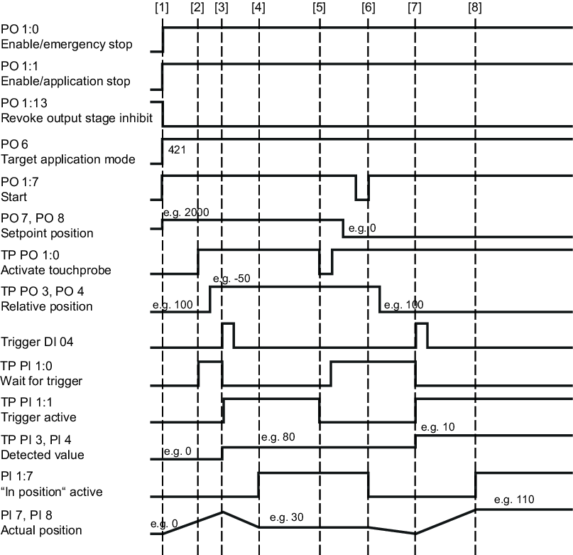 As of version 2.1 of the software modules, the system briefly switches to FCB 26 to set the reference point of the relative positioning correctly when activating the application modes "401: Relative positioning", "402: Modulo positioning – positive direction", "403: Modulo positioning – negative direction", and "404: Modulo positioning – optimized direction" for the first time.