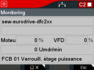 Le menu de surveillance fait office d'écran d'accueil (par défaut) dans les deux modes d'exploitation. Il indique la charge actuelle du moteur ainsi que la charge actuelle de l'étage de puissance. La vitesse actuelle en unités utilisateur et le bloc fonction FCB ou le défaut en cours sont aussi affichés.