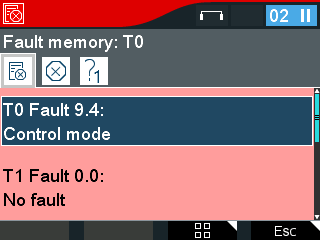 | På 1. fane listes feilminne T0-T4 opp. Trykk på piltastene <opp/ned> for å velge feilminne. På de andre fanene vises tilleggsinformasjon om det valgte feilminnet. |