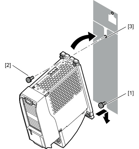 - Presione el variador hacia atrás de modo que el tornillo de fijación [2] entren en el agujero superior del panel posterior de la unidad y en el agujero roscado de la placa de montaje.