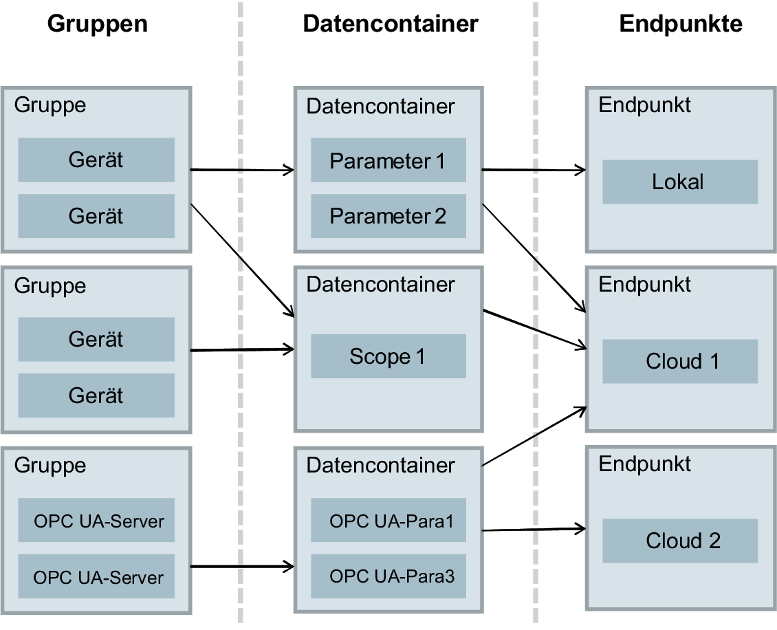 Das Einrichten der Datenerfassung basiert auf den 3 zu konfigurierenden Grundelementen "Gruppe", "Datencontainer" und "Endpunkt". Von zentraler Bedeutung sind dabei die Datencontainer. In den Datencontainern wird nach dem Scannen und Gruppieren der Geräte sowie dem Einrichten von Endpunkten festgelegt, welche Daten welcher Geräte zu welchen Endpunkten gesendet werden. Die genaue Abfolge der durchzuführenden Inbetriebnahme-Schritte finden Sie im Kapitel Inbetriebnahme.