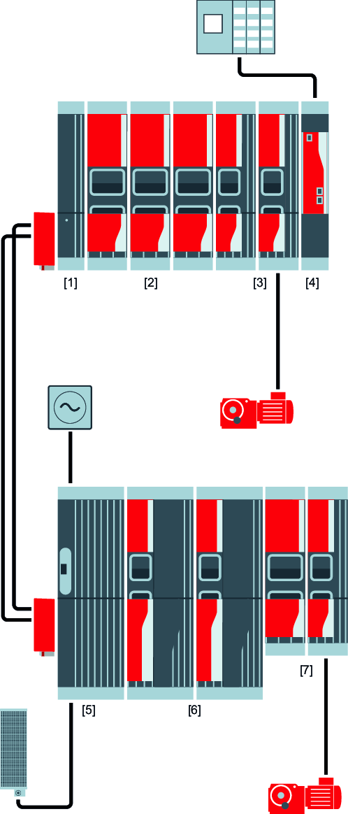 Se a largura do painel elétrico for limitada, os módulos podem ser instalados em 2 linhas, uma acima da outra. A distância entre a linha principal e a linha auxiliar é fixa. Somente um número limitado de módulos e tipos de módulos limitados são permitidos na linha auxiliar. A conexão entre a linha principal e a linha auxiliar é feita com caixas de conexão e conjuntos de cabos para conexão do circuito intermediário.