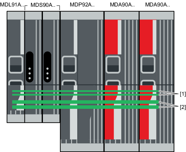 A figura a seguir mostra um exemplo de conexão usando dois módulos de fonte chaveada MDS90A..., um módulo de acoplamento MDL91A... e um módulo de rede com tensão do circuito intermediário regulada MDP92A... O módulo de fonte chaveada MDS90A.. alimenta os módulos com tensão de 26.4 VCC diretamente através do barramento X5 de 24 VCC.