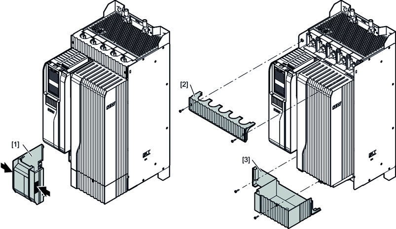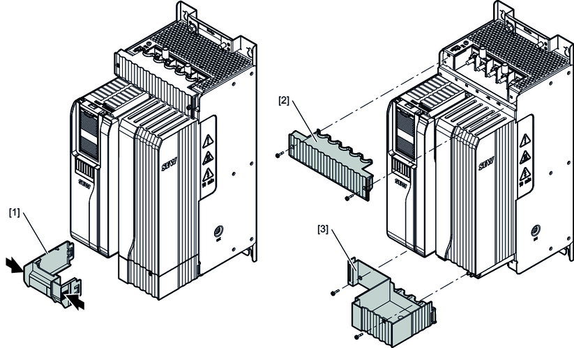 Pour le raccordement du réseau et du circuit intermédiaire et le raccordement du moteur et de la résistance de freinage sur les variateurs de vitesse à partir de la taille 5, démonter puis remonter des protections contre le toucher.