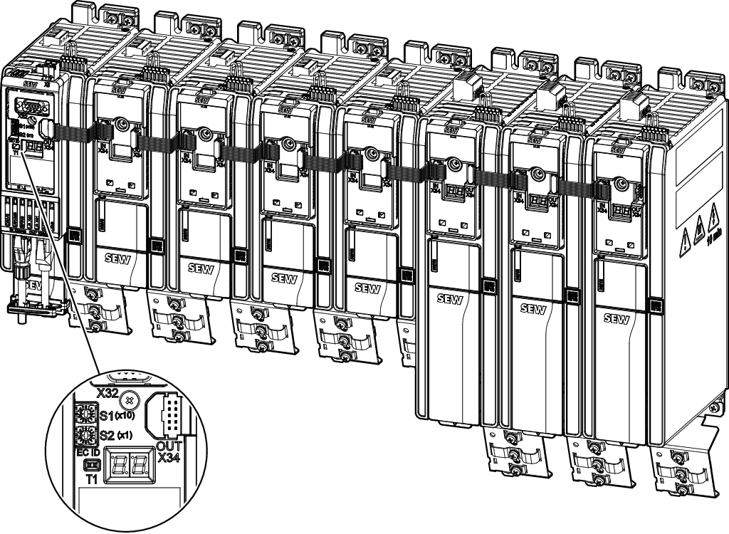 - Wenn Optionen auf dem Umrichter montiert sind, lädt sich automatisch die Konfiguration für einen Feldbus- oder Bus-Betrieb. Die Digitaleingänge sowie alle anderen Klemmen und die Busanschaltung werden vorbelegt, siehe Kapitel Automatische Konfiguration bei Gateway-Betrieb.