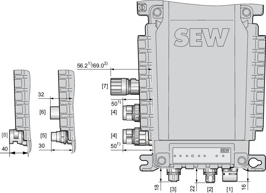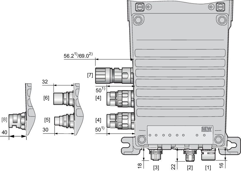 规格MMF32../DFC..和MMF32../DSI..的插接头位置